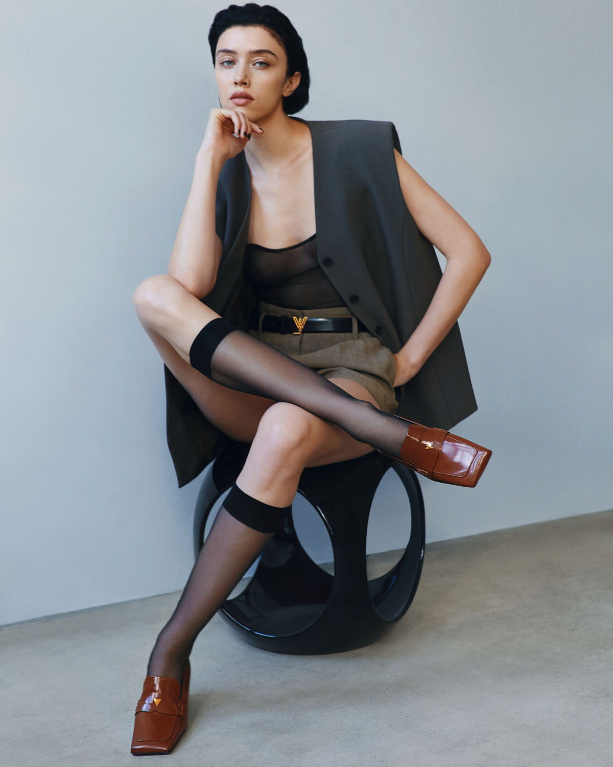 Złote tłoczenia w gładkiej skórze, wyraziste przeszycia, finezyjne wykorzystanie logo marki zarówno w sprzączkach pasków, jak i brelokach zamków, kwadratowe noski mokasynów to kwintesencja nowoczesnego spojrzenia na power dressing. Od złamanej bieli, przez ciepłą szarość, karmelowe i orzechowe odcienie brązu i kończąc na klasycznej, głębokiej czerni. Delikatne niuansy kolorystyczne to efekt pracy przy tworzeniu palety barw na potrzeby kolekcji.