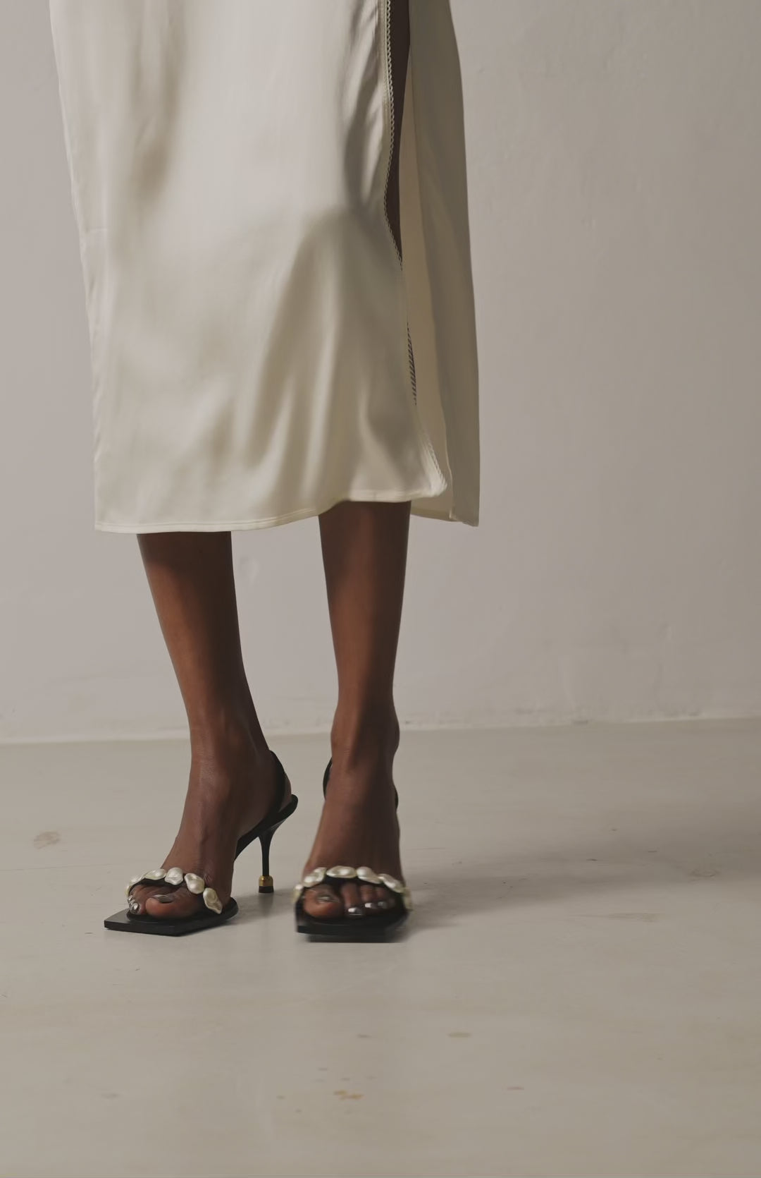 Sandały na obcasie. Delikatne paski przy pięcie zapewniają stabilność i subtelnie eksponują stopę, nadając całości lekkości. Krój butów został zaprojektowany tak, aby optycznie wysmuklać nogę i podkreślać elegancką linię sylwetki. Szeroki pasek z rzeźbionymi, perłowymi kamieniami podkreśla elegancki charakter całości. Podobnie jak wysoka szpilka, zwieńczona złotą kulką Vanda Novak. Detal ten dodaje butom wyrazu i zapewnia stabilność. Wkładka z pianki memory gwarantuje niezrównany komfort podczas chodzenia.