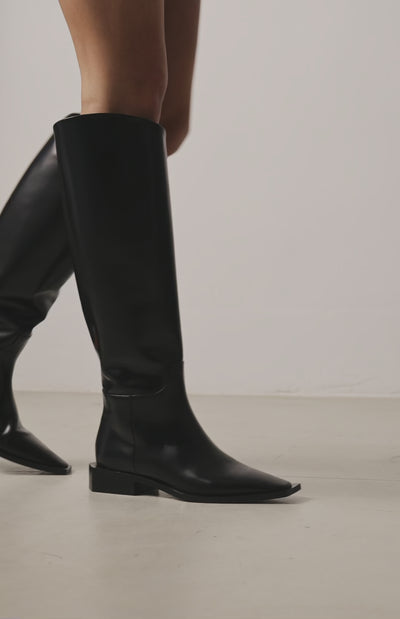 Krój kozaków nawiązujący do oficerek dodaje im charakteru. O unikatowości zaś świadczą detale, takie jak kwadratowe, lekko przedłużone noski, asymetryczne zakończenie cholewki czy geometryczne, ścięte obcasy.