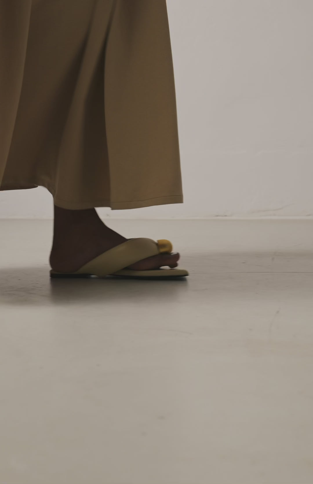 Leather flip-flops made of high-quality Italian leather in an elegant shade of ivory. The golden ball, set centrally on the straps running along the foot, refers to the brand's characteristic detail - known from heeled models.