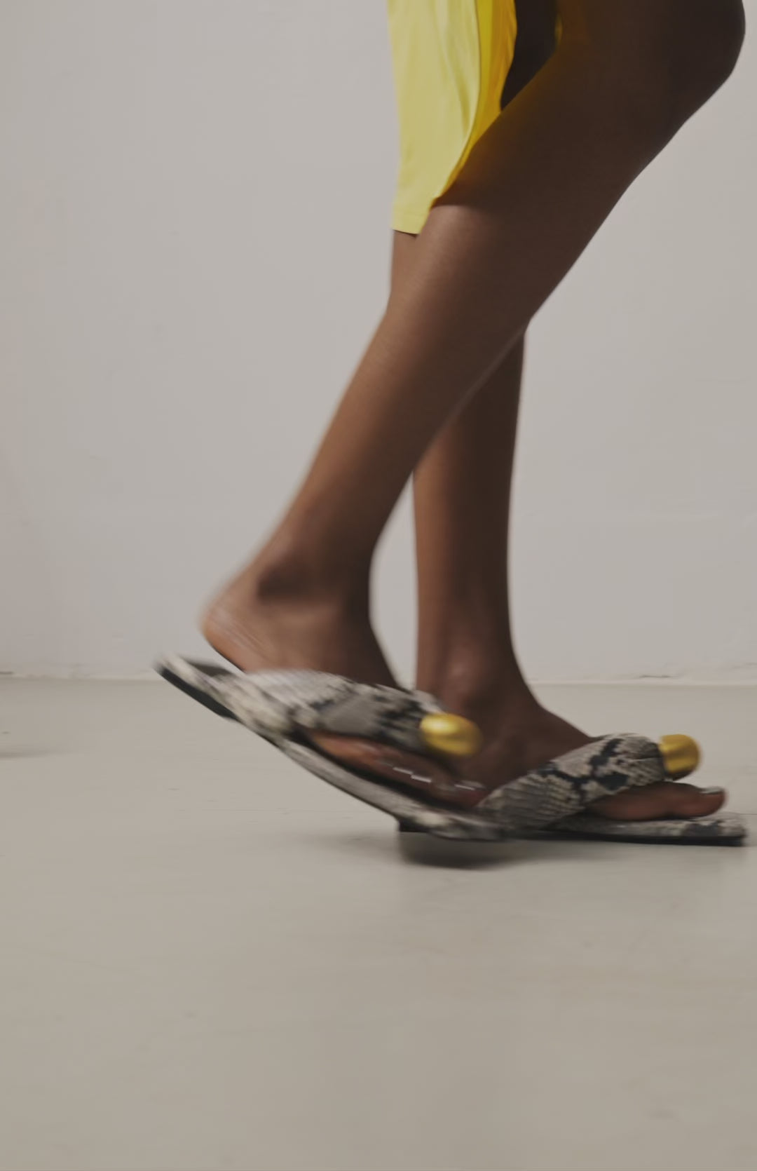 Leather flip-flops with a geometric design, made of high-quality Italian leather in a shade of gray python. The brand's characteristic golden ball, this time, due to the flat sole, is placed in the middle of the straps on the instep.