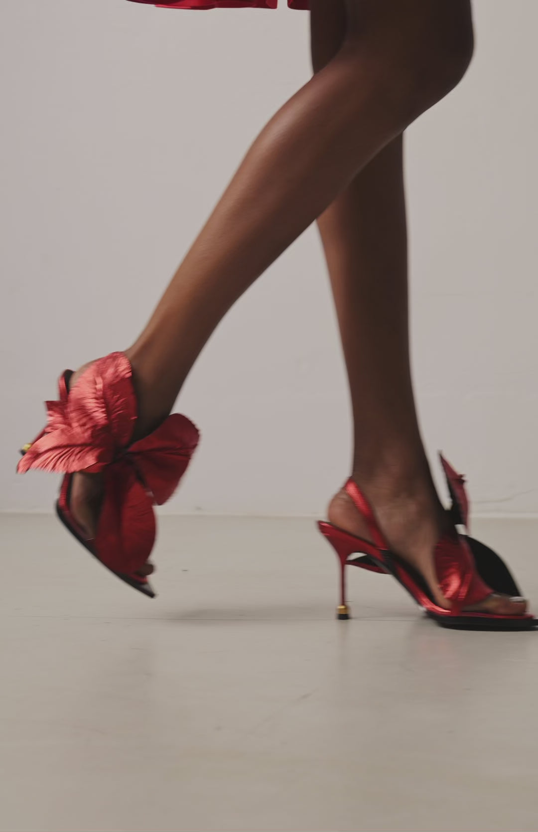 High-heeled sandals made of high-quality leather. A characteristic element of the model is a leather application in the shape of a phenomenal flower. It gives the shoe a three-dimensional effect and attracts attention with its unusual form. The transparent strap on the toes ensures a comfortable fit, while emphasizing the line of the foot. The 85-millimeter high heel is finished with a golden ball, thanks to which the shoes are stable and comfortable. Comfort is additionally provided by a memory foam insole, which cushions every step and makes the shoes very soft.