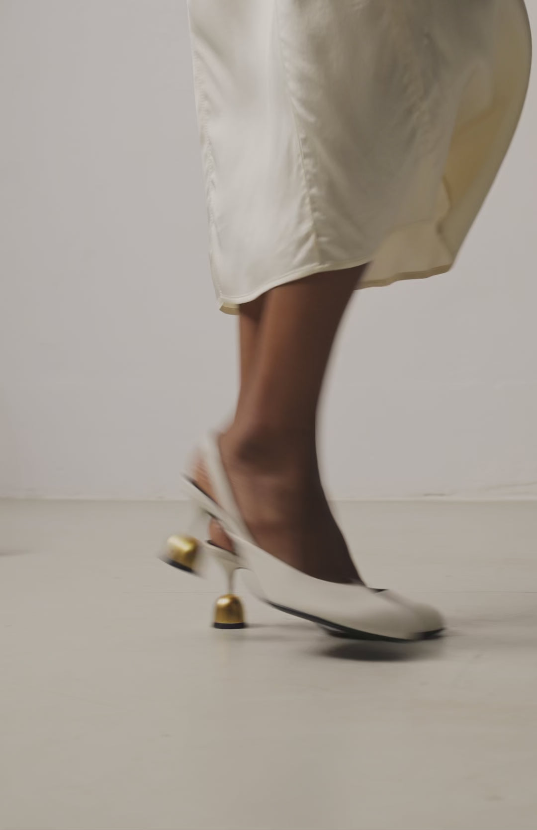 Pumps in a cream shade with an open heel. The shoes are not only feminine, but also very comfortable. The rounded front and memory foam insole make the shoes exceptionally comfortable. Stabilization and cushioning are provided by a large, golden Vanda Novak ball, crowning the heel and a strap running along the back of the foot. A 65-millimeter stiletto gives the whole a feminine character. Both the sole, the upper and the lining are made of Italian natural leather, imported from the best suppliers and then assembled in Poland.